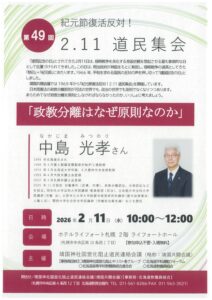 2026年1月13日 札幌平和運動フォーラム発第2号 労働組合委員長 各 級 議 員 各 位 関係団体代表者 札幌平和運動フォーラム 代表幹事 那須 敏裕 代表幹事 池田 裕二 「第49回紀元節復活反対 2・11道民集会」への参加要請について 日頃からのご奮闘に心から敬意を表します。 さて、「建国記念の日」とされてきた2月11日は、神話をもとに明治政府が制定し、 侵略戦争美化の道具としてきた「紀元節」にあたります。かつて日本は、皇国史観のも と、アジア・太平洋の人々に侵略し、植民地支配の不当な犠牲を強いてきました。 1966年に当時の政府・自民党は、各界の反対を押し切り2月11日をを「建国記 念の日」としました。これに対して、労働組合・民主団体によって結成された「靖国神 社国営化阻止道民連絡会議(略称:靖国共闘会議)」は、1969年から「紀元節復活 反対2・11道民集会」を開催してきました。労働界の再編成に伴って別開催となった 時期もありましたが、2005年度から統一開催が復活し、北海道平和運動フォーラム は事務局団体となっています。 今年度の「第49回紀元節復活反対2・11道民集会」は、下記の要領で開催します ので、積極的な参加を要請いたします。 記 1 名 称 第49回紀元節復活反対2・11道民集会 2 日 時 2026年2月11日(水)10:00~12:00 3 会 場 ホテルライフォート札幌 2F ライフォートホール (札幌市中央区南10条西1丁目) 4 主 催 靖国神社国営化阻止道民連絡会議(略称:靖国共闘会議) 5 講 演 「政教分離は なぜ原則なのか」 講師 中島 光孝さん(なかじま みつのり・弁護士) ※プロフィール等はチラシをご参照ください。 6 参加要請 上部組織が北海道平和運動フォーラムに加盟している単組につきましては 「産別タテ」の要請指示に従ってください。 札幌平和運動フォーラム直加盟の単組につきましては、積極的な参加にご 協力よろしくお願いいたします。 以 上