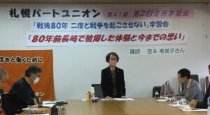 10月18日、札幌パートユニオンは宮本須美子さん(一般社団法人北海道被爆者連絡センター 代表理事)を講師にお招きし平和学習会を開催しました。冒頭、札幌パートユニオン大木会長は戦後80年を迎えた今、日本のみならず世界で平和確保には力と武器の行使もやむを得ないという言葉があふれ出している。大変な危機とすべきで、私たちは二度と戦争を起こさせないという事を主張していこう、と檄を飛ばしました。講演では、宮本さん自身が長崎で体験した原爆投下直後の街の様子・被爆者の姿・独特な臭気には悲しさと怒り以上に、二度とあってはならないとの思いを強くしたとし、その思いは年を経るごと強くなるとしました。また、被爆地から徒歩で家族と疎開した先で体験した村人の暖かさは今を生きる糧になっているとし、人が人を支えるということが平和の基本ではないかとしました。参加者は30分を超える講演に熱心に聞き入り涙を拭きながらメモをとる姿もありました。宮本須美子さん、貴重なお話ありがとうございました。私たちも日々の活動の中で平和の大切さを発信していきます。