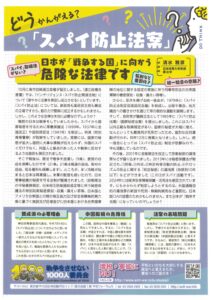 就任早々、外交・経済対策で高市色を強く出す内閣ですが、 自民・維新の両党は、憲法9条改正と緊急事態条項創設に向けた両党による条文起草協議会設置、「スパイ防止法」制定などの項目を含む「連立合意書」を交わしています。首相所信表明演説では、軍事費増大と軍備拡大、改憲を進めると発言しています。また、日米首脳会談でもトランプ大統領に対し軍事費と軍備を拡大する方針を約束しています。このような中、「戦争をさせない1000人委員会」は、国民の知る権利や思想信条の自由、言論の自由やプライバシーも侵害される恐れがある「スパイ防止法」の危険性について、理解を深めるためのチラシ作成しました。以下のとおりです。今そこにある危機にならんとする状況です。仲間と共に一読し、危険認識を一致させましょう。