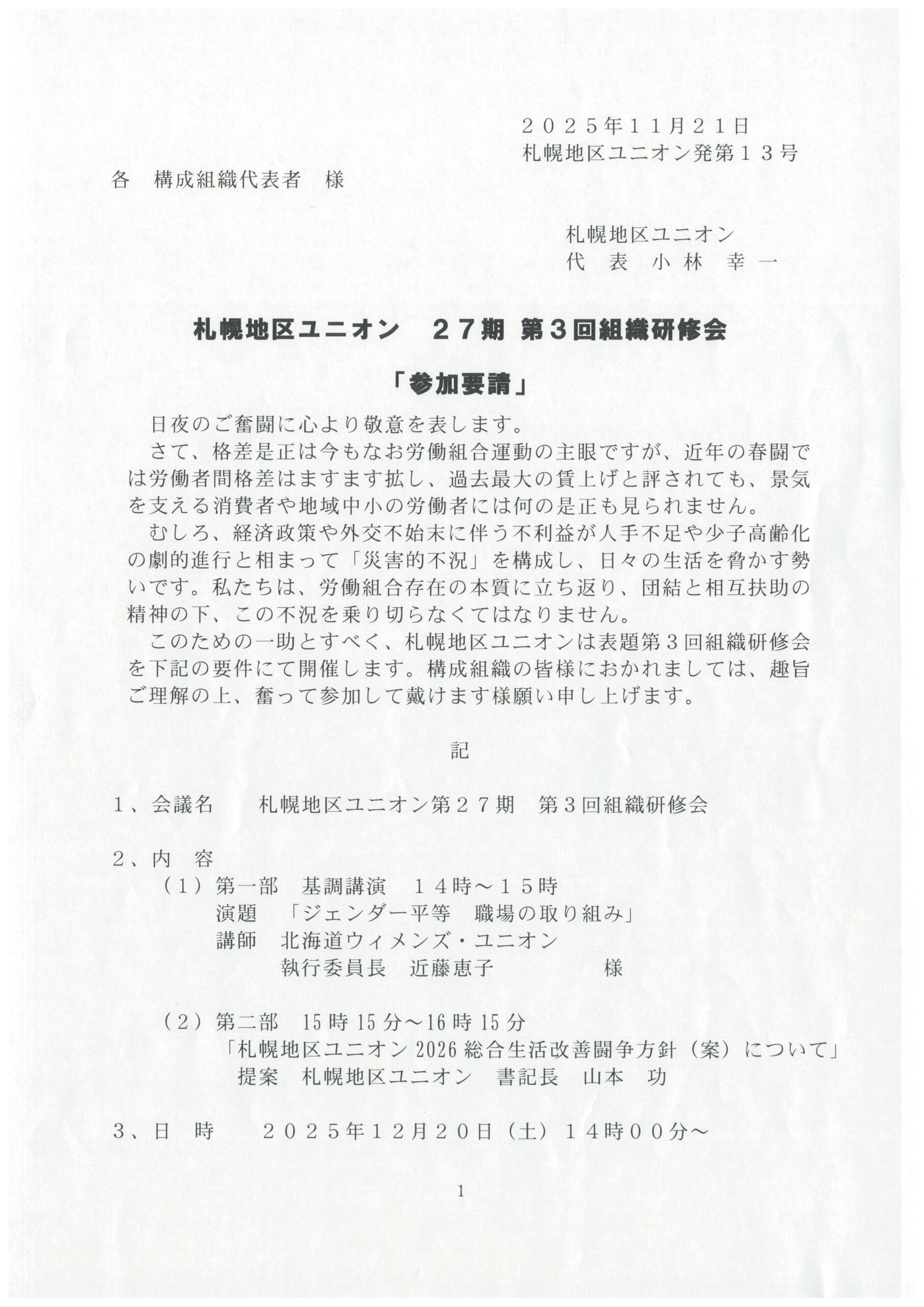 【告知】 札幌地区ユニオン 第27期 第3回組織研修会開催します。 日時:2025年12月20日(土)14時~ 場所:ほくろうビル内会議室 内容:➀特別講演 「ジェンダー平等 職場の取り組み」 講師 依頼中 ➁2026札幌地区ユニオン 総合労働条件改善闘争方針(案) 提案 札幌地区ユニオン 書記長 山本 功 備考:11月20日第7回執行委員会で承認された内容を発文13号 で確認してください。各組合に郵送しています。