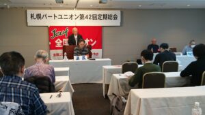 札幌パートユニオンは4月11日、ホテルポールスター札幌で第42回定期総会を開催しました。冒頭、大木会長は国内外に散見される不安の原因は須らく大国エゴに起因するもので私達の通念では理解し難いとしました。日本は世界唯一の被爆敗戦国、焼土から復興した経済再生国として、エゴによる紛争の愚かしさを証明し対話による平和確立の尊さを説く責務があるとしました。今、政府与党で企む改憲・労働法制改悪は過去の過ちを辿る危険を孕み、法改悪を前提とした経済政策を進めようとする財界は隣国・世界を再び混乱に巻き込む恐怖を演出しようとしている、今こそ、札幌パートユニオンは人権・平和・公正社会の保護・拡張を大声で主張しようと檄を飛ばしました。2026年度運動方針では、高市政権の主張する、労働法制改悪・改憲・武器輸出を可能とする施策を断固粉砕し、最賃引き上げ、生活可能な労働諸条件き上げ及び政治方針等が山本事務局長より提案され、何れも満場一致で可決されました。参加組合員は引き続き、札幌地区ユニオン第28回定期総会等に参加しました。皆さん大変ご苦労様でした。